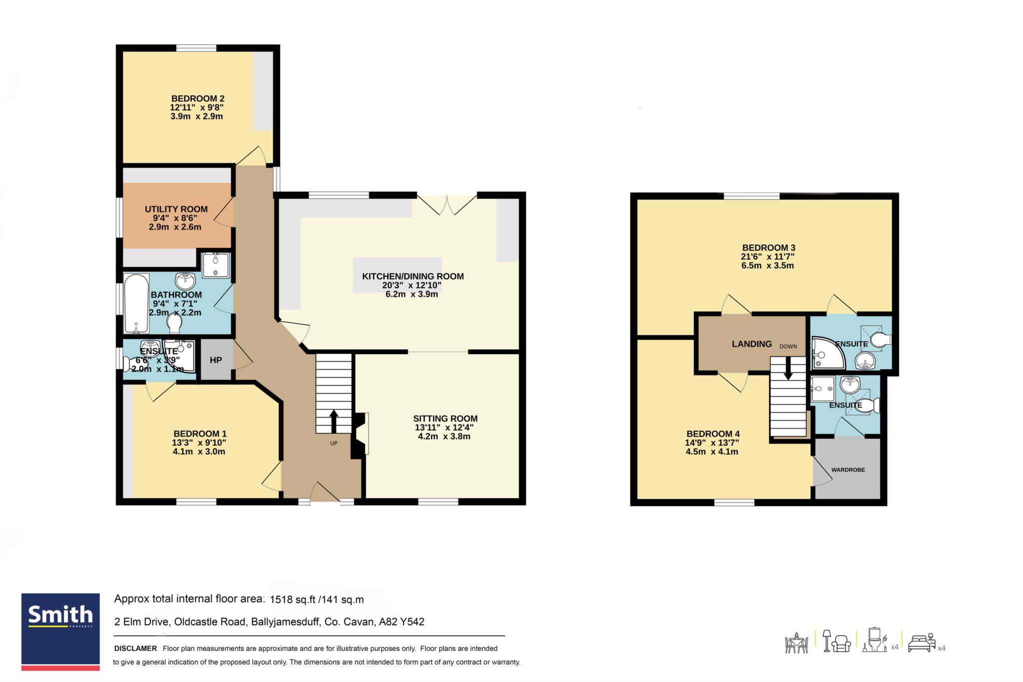 Measuring approximately 1,518 sq. ft., this distinguished residence combines style, comfort, and efficiency in equal measure. The accommodation is generous and beautifully balanced, comprising four double bedrooms two at ground level and two on the first floor together with a welcoming entrance hall, an elegant sitting room, a modern kitchen/dining room, family bathroom, and utility.